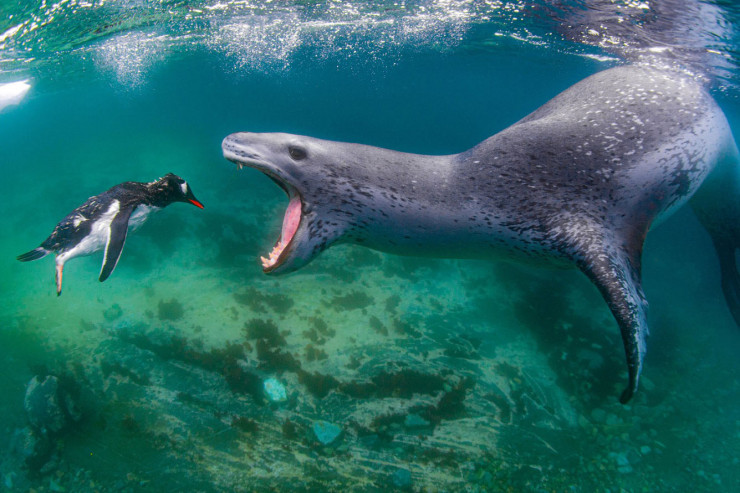 Амос Нахум стал победителем в номинации "Водная жизнь". С их шелковистой шерстью, большими темными глазами и вечными ухмылками леопардовые тюлени могут выглядеть совершенно безобидно. Однако у пингвинов другое мнение об этих мощных хищниках.