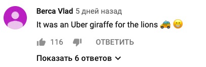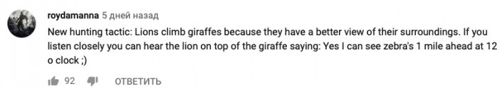 "Это такая новая охотничья тактика у львов. Они забираются на жирафа, чтобы лучше видеть окрестности. Если прислушаться, можно было бы услышать, как лев шепчет: "Да, вижу зебру на 12 часов"".
