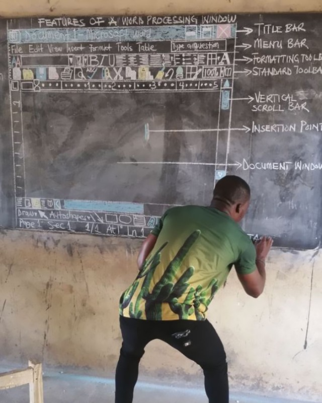 Ричард Акото разместил в соцсетях пост, в котором рассказал, как занимается с детьми в школе, а именно знакомит их с программой Microsoft Word. Вроде ничего особенного, если не тот факт, что интерфейс программы он по памяти подробно разрисовывает с пояснениями на доске.