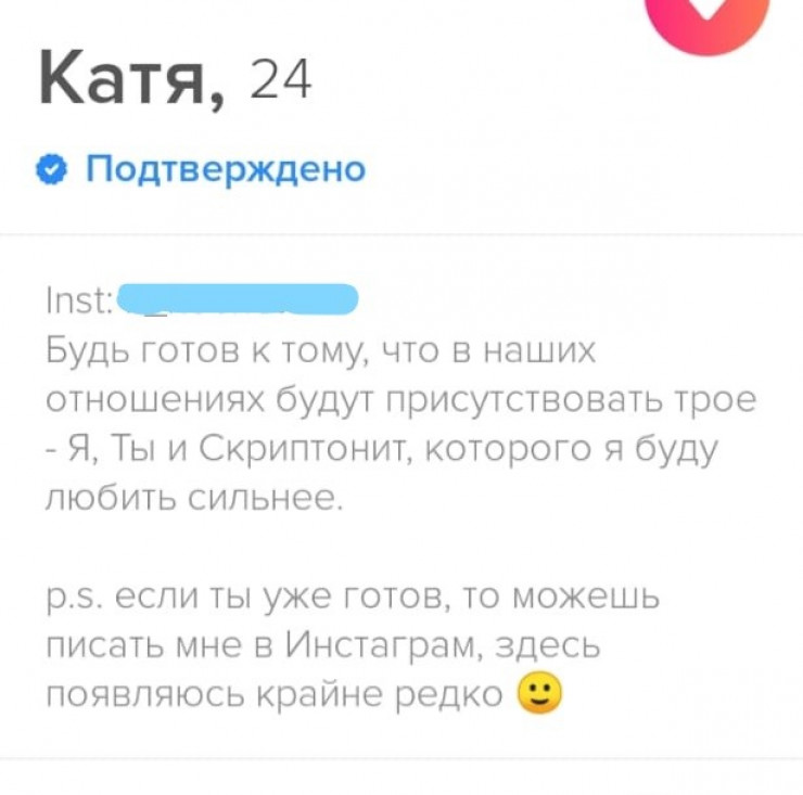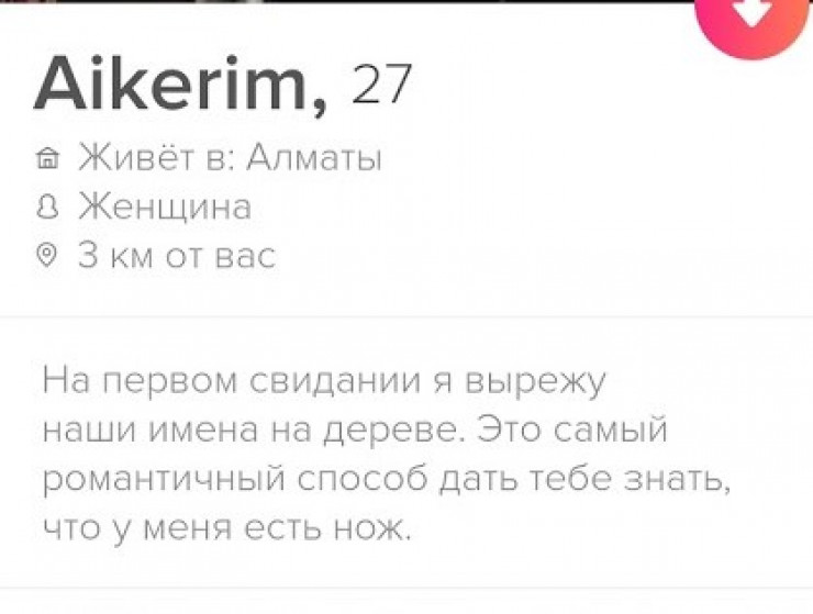 Для кого-то популярное приложение Tinder - это способ завести новые, ни к чему не обязывающие знакомства. Кто-то ищет здесь серьезные отношения и даже находит партнера на всю жизнь. Но если в офлайне, как говорится, встречают по одежке, то в Tinder "встречают" по анкете. Конкуренция большая. Корреспондент TengriMIX решил узнать, насколько креативны казахстанские пользователи.
