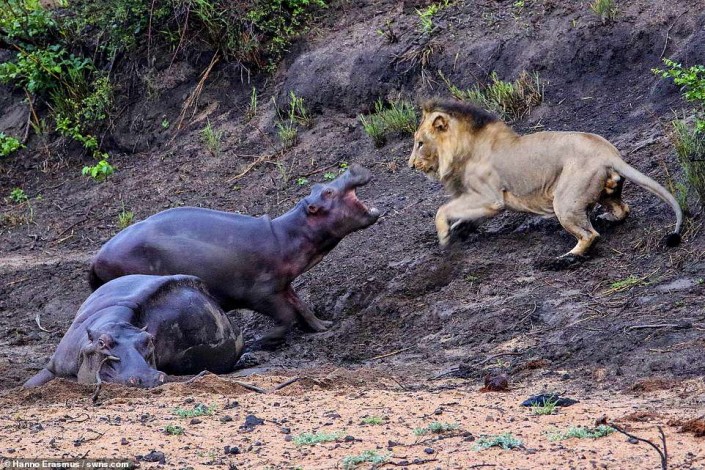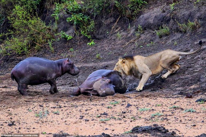Фотограф Ханно Эразмус запечатлел душещипательный фрагмент из жизни дикой природы в национальном парке Крюгера, который находится на северо-востоке ЮАР. Самка гиппопотама застряла в грязи и, не сумев выбраться, лежала без сил в ожидании своей участи. Этим решил воспользоваться проходивший мимо голодный лев. Но ему помешал детеныш бегемота, который, защищая свою маму, начал прыгать и бегать за хищником.