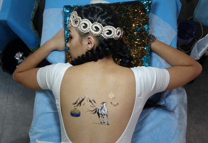 "Я окружила себя национальными атрибутами, одела модель в орнаментальном стиле и сделала все в голубых и золотых цветах. На спине у своей девушки я нарисовала жайляу - казахскую степь. Основные сложности были у меня с лошадкой, потому что если бы я не забила внутреннюю часть серебром, работа казалась бы простой", - поделилась Еркемай.