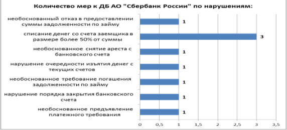 По данным Нацбанка, ограниченные меры воздействия в отношении ДБ АО "Сбербанк России" составляют 14 процентов от общего количества. Банку вынесено 9 письменных предписаний, из которых 5 - за нарушение порядка взыскания просроченной задолженности по займу, в том числе в размере, превышающем 50 процентов от денег, находящихся на банковском счете / поступающих на банковский счет заемщика.