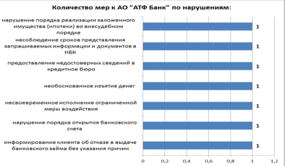 АО "АТФ Банк", как видно из диаграммы, допущены нарушения по вопросам банковского обслуживания, а также обслуживания банковского займа, что составляет 11 процентов от принятых мер в отношении банков. АО "АТФ Банк" вынесено 5 письменных предписаний, а также наложено 2 штрафа (за предоставление недостоверных сведений в кредитное бюро, а также несвоевременное исполнение ограниченной меры воздействия).