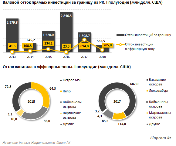 В 2017 году зафиксирован самый крупный отток активов из РК в офшоры, за год их объем достиг 1 миллиарда долларов, а их удельный вес в структуре инвестиций за границу составил 50,4 процента.