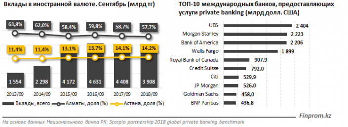 По оценке аналитиков сайта, на данный момент потенциал рынка private banking составляет чуть более 1 триллиона тенге, следовательно, состояние сегмента богатых клиентов преимущественно находится за границей и обслуживается международными банками. В топ-25 крупнейших банков мира в 2017 году средства состоятельных лиц под управлением составляют 16,2 триллиона долларов. Крупнейшим private-банком является швейцарский UBS - 2,4 триллиона долларов активов под управлением.