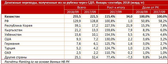 По данным Ranking.kz (по состоянию на сентябрь 2018 года), объем денежных переводов через СДП, полученных из-за рубежа, за январь-сентябрь 2018 года составил 255,5 миллиарда тенге, рост за год на 15,4 процента. По объему полученных из-за рубежа денег лидирует Российская Федерация, откуда было переведено 129,9 миллиарда тенге. Доля от РК при этом составила 50,8 процента. Следом идут переводы из Южной Кореи: 39,1 миллиарда тенге, рост в 2,3 раза. Доля страны выросла с 7,8 процента до 15,3 процента. Замыкает тройку лидеров Кыргызстан: 21,2 миллиарда тенге, рост за год на 59,6 процента. Доля страны выросла с 6 процентов до 8,3 процента.