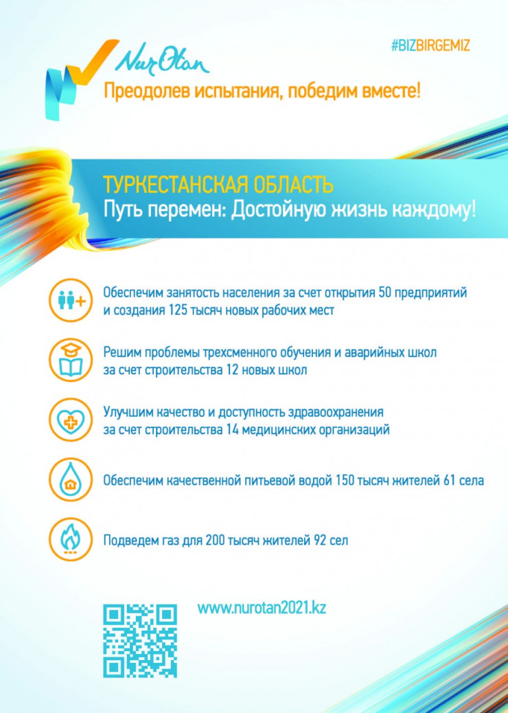 Республиканский предвыборный штаб партии Nur Otan прибыл в Туркестанскую область. Порядка 60 активистов партии, лидеров общественного мнения и кандидатов в партийные списки провели несколько десятков встреч, в том числе с аграриями, учителями, врачами, людьми с особыми потребностями и многими другими, охватив более половины территории региона.