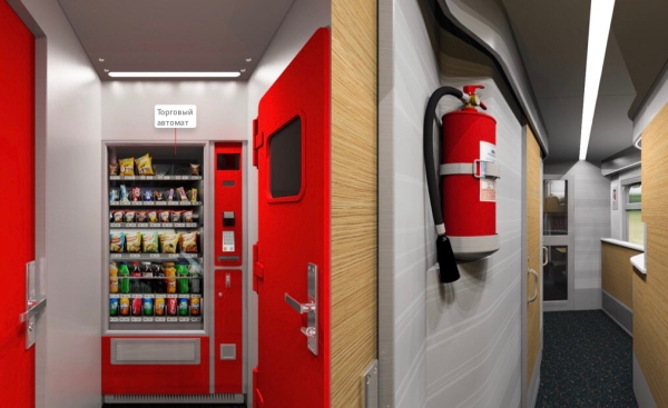 Интерьер выполнен в светлых тонах, сами полки - в серых, с красными подголовниками. Столики и перегородки - под светлое дерево.