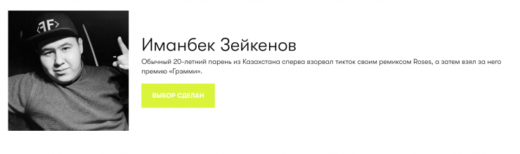 20-летний Иманбек Зейкенов стал первым казахстанцем, который был номинирован и выиграл "Грэмми". Он получил статуэтку за ремикс на композицию "Roses" SAINt JHN. До прихода славы Иманбек работал железнодорожником в Аксу. За это время он уже успел записать ремиксы и треки с такими всемирно известными артистами, как Рита Ора, Usher, David Guetta, 50 Cent, Sean Paul и Sofia Reyes и многими другими.