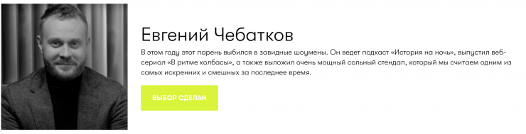 Кроме Иманбека, на награду номинированы актеры Федор Федотов и Владимир Онохов, музыкант Soda Luv, режиссер Евгений Сангаджиев.