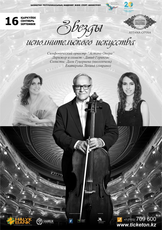 Их имена широко известны во всем мире: виолончелист и дирижер, лауреат первой премии (золотая медаль) Международного конкурса имени Чайковского Давид Герингас; лауреат первой премии Международного конкурса имени Кнушевицкого Дали Гуцериева (виолончель) и лауреат первой премии Международного конкурса вокалистов Пласидо Доминго "Опералия" Екатерина Лехина (сопрано). Программа концерта "Звезды исполнительского искусства" также пройдет в блистательном исполнении симфонического оркестра "Астана Опера".