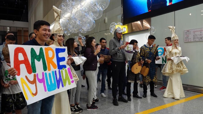 В три часа ночи певца в аэропорту встречали кумысом и лепешками, воздушными шарами и плакатами, шашу из конфет и прямыми трансляциями в Instagram.