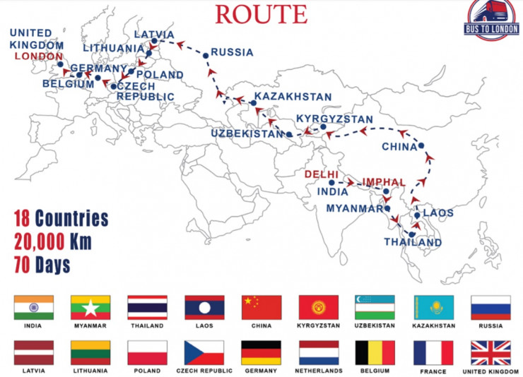 "Туристы смогут побывать в Мьянме, Таиланде, Лаосе, Китае, Казахстане, Кыргызстане, Узбекистане, России, Литве, Латвии, Польше, Чехии, Германии, Нидерландах, Бельгии, Франции и Великобритании", - говорится на официальном сайте организаторов поездки.