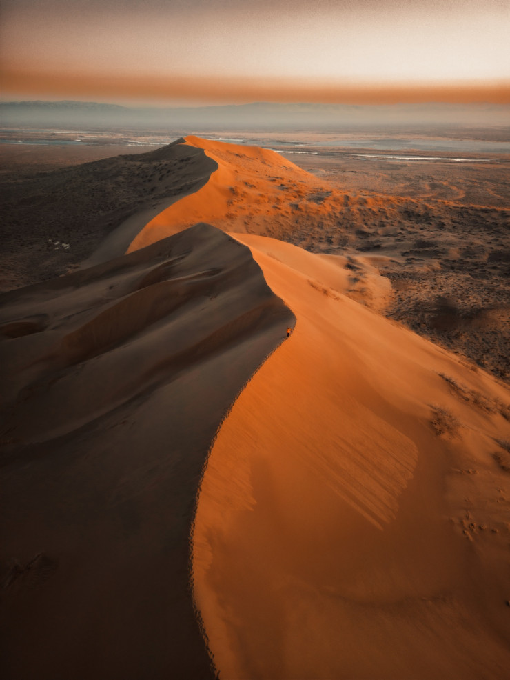 "На бархан мы приехали перед закатом, чтобы застать красивый свет, режимный свет с небом красивым. И там получается интересная светотень, когда половина бархана в тени, а половина окрашена золотисто-оранжевым солнцем. Это было снято 28 февраля, а на фото, когда смотришь, как будто лето. На самом деле там была ночью минусовая температура, ветра там очень холодные. Я выкладывал сторис потом, что катался на сноуборде по песку", - делится Александр Кузнецов.