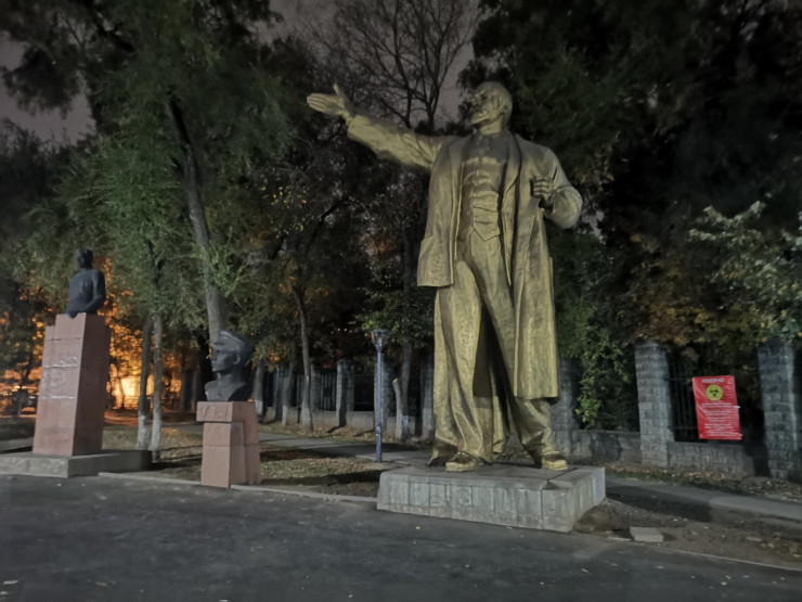 Осталась последняя и самая крупная точка нашего маршрута. Это сквер за кинотеатром "Сары-Арка" на пересечении проспектов Абая и Алтынсарина, который является последним пристанищем для памятников Владимиру Ленину, Михаилу Фрунзе, Максиму Горькому, Михаилу Калинину, борцам Октябрьской революции, Павлу Виноградову и Дмитрию Фурманову. Они все когда-то возвышались на алматинских улицах.