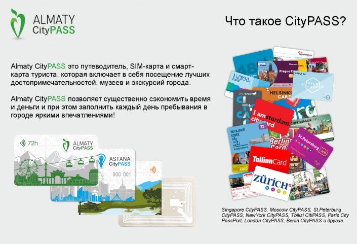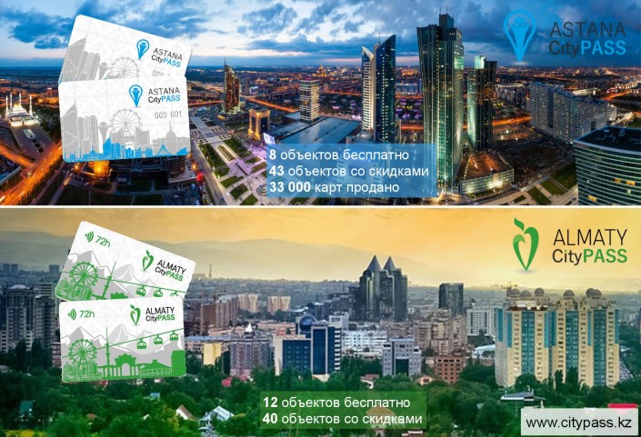 Проект "CityPASS Kazakhstan" был запущен при поддержке АО "НК "Kazakh Tourism" и ТОО "Астана Конвешн Бюро" в прошлом году в Астане. За 2017 год было реализовано более 30 тысяч карт Astana CityPASS. Более подробную информацию вы можете получить по телефону 8(7172) 47-85-65 или на сайте www.citypass.kz.