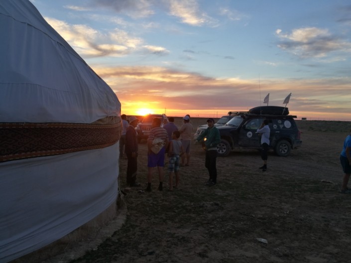 Держа курс уже на Астану и стараясь успеть в срок, участники экспедиции вынуждены были продолжать движение в темноте. Поэтому нередко выбирать место для ночлега приходится впопыхах или же обращаться за помощью к местным жителям. Так, близ поселка Индерборский караван экспедиции остановился в гостях у одного местного жителя, который любезно предоставил путникам свою юрту.