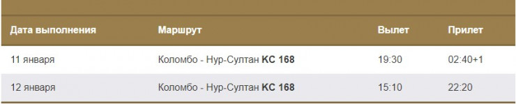 - из столицы Шри-Ланки Коломбо, ориентировочное время прибытия в 02.40 ночи. Еще один рейс из Коломбо в столицу Казахстана запланирован на 12 января;