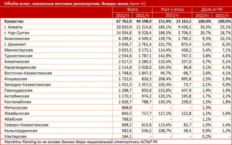 По итогам первого полугодия 2022 года объем услуг, оказанных гостиницами, отелями и другими местами размещения в Казахстане, составил 67,8 миллиарда тенге - на 51,9 процента больше в стоимостном выражении, чем годом ранее, передает Tengritravel.kz со ссылкой на Ranking.kz.