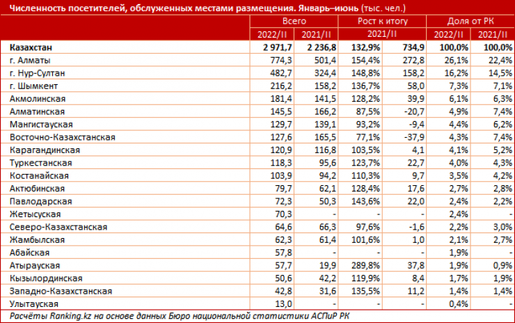 За шесть месяцев 2022 года места размещения обслужили почти 3 миллиона гостей — на 32,9 процента больше, чем годом ранее.