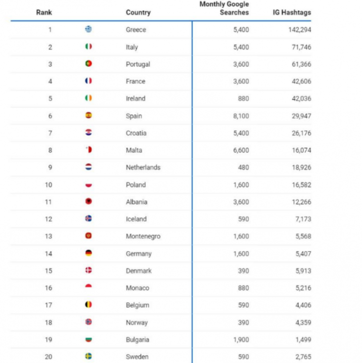 В результате лидирующую строчку заняла Греция, собрав 5,4 тысячи поисковых запросов в Google каждый месяц и более 142 тысяч хештегов в Instagram.