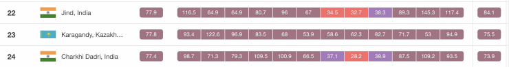 Первое место в рейтинге самых загрязненных городов занимает пакистанский Лахор с индексом загрязнения 97,4. На втором месте китайский Хотан с индексом загрязнения 94,3. Тройку антирейтинга закрывает индийский город Бхивади с индексом 92,7.