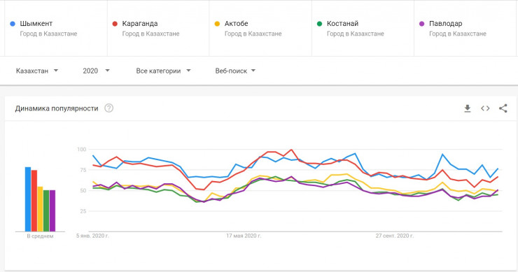 Любому областному центру сложно конкурировать в популярности с Нур-Султаном и Алматы, поэтому эти мегаполисы мы не стали включать в свой рейтинг. Но кто же вошел в ТОП-5 популярных городов Казахстана в Google? Перейдем к списку.