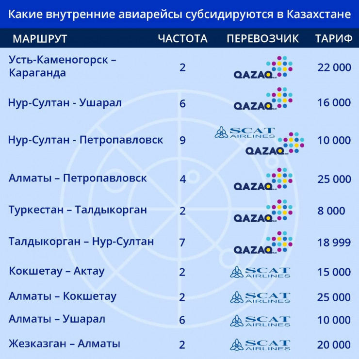 Стоимость билетов по данным маршрутам составляет от восьми до 25 тысяч тенге в зависимости от направления. Отмечается, что цены на эти билеты являются фиксированными и не меняются с момента открытия рейса.