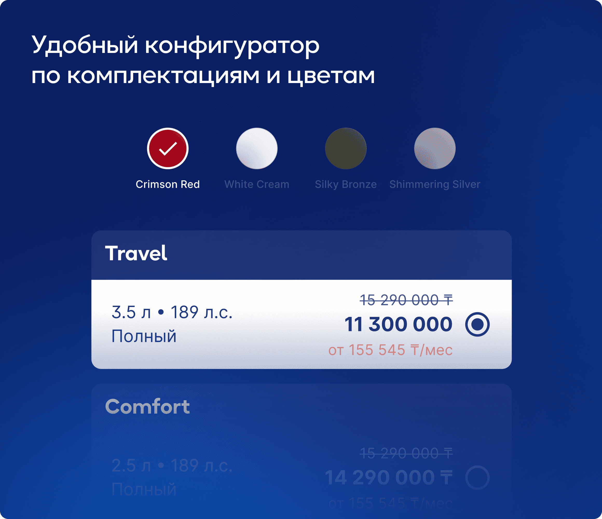 - Выберите автомобиль, цвет, комплектацию и удобный способ оплаты