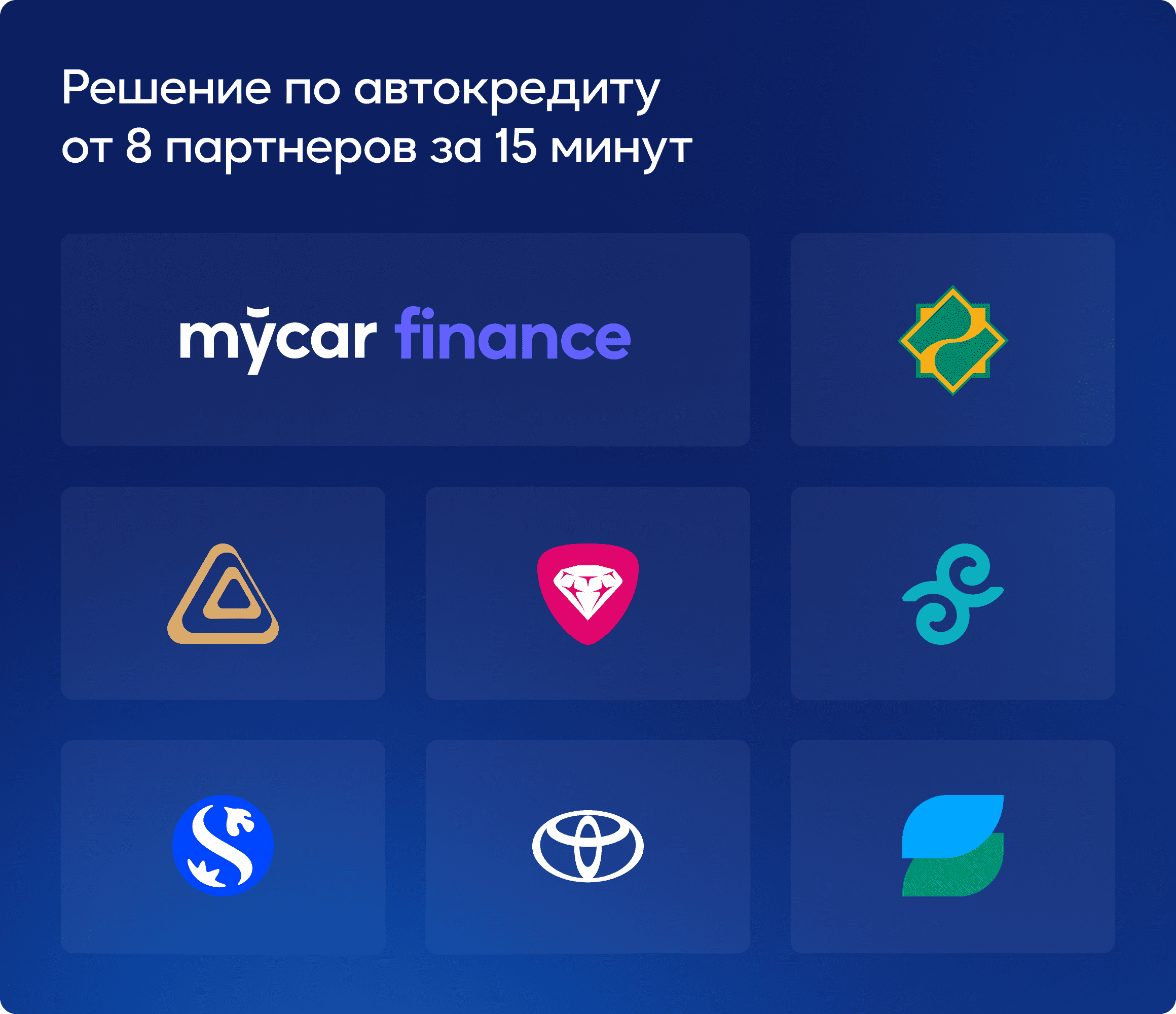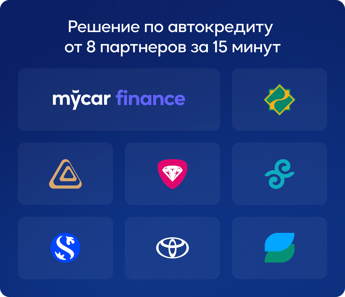 Mycar Finance, Банк ЦентрКредит, Eurasian Bank, Halyk Bank, Forte Bank, Sapa Digital Finance, Shinhan Finance, Toyota Financial Services