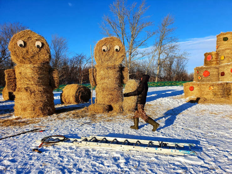 Автор этой задумки - депутат и глава сельского хозяйства Владимир Журжа. Задумка создать в селе вот такую инсталляцию из соломенных фигур у Владимира появилась давно, лет 8-10 назад, во время поездки в Беларусь. Там он и обратил внимание на необычные арт-объекты из соломы. Правда, воплотить в реальность эту идею смог только в этом году, приобретя новое оборудование. С помощью него в хозяйстве смогли производить именно рулонные тюки.