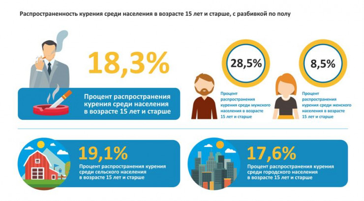 В 2020 году распространенность курения среди населения Казахстана в возрасте 18 лет и старше выглядела таким образом: