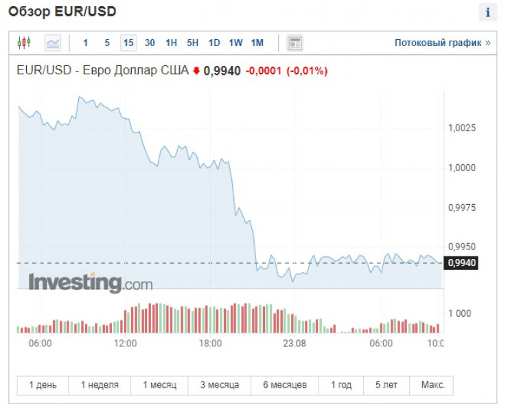Курс евро к доллару ранее упал до отметки 0,9935 доллара впервые с декабря 2002 года.