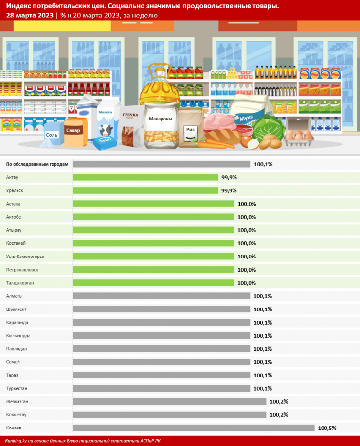 По мегаполисам и областным центрам республики ситуация следующая: в двух городах цены за последнюю неделю марта снизились (в Актау и Уральске на 0,1 процента за период 20–28 марта), еще в семи - Астане, Актобе, Атырау, Костанае, Усть-Каменогорске, Петропавловске и Талдыкоргане - цены остались без изменений. Среди регионов, где отмечено общее удешевление, находится и Мангистауская область.