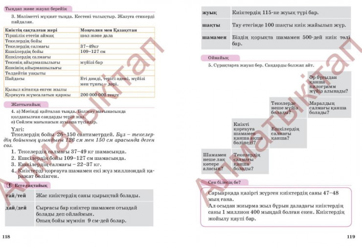 А эксперт по казахскому языку отметил некоторые ошибки в терминах. Ардак Нурмаганбет отмечает, что авторы учебника употребили слово "ешкі" для обозначения самки сайгака и "теке" - самца, что с казахского переводится как "коза" и "козел". По его словам, такие данные могут запутать учеников четвертого класса. Он также объяснил, что потомство сайгаков называют "лақ" в разговорном стиле, а на литературном языке нужно говорить "құралай".