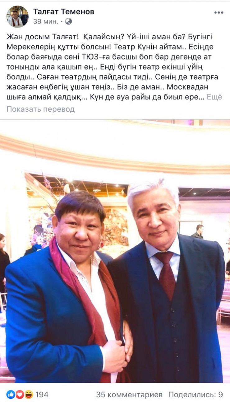 Художественный руководитель казахского драмтеатра имени Калибека Куанышбаева Талгат Теменов опубликовал на своей странице в Facebook сообщение, полученное от Имангали Тасмагамбетова, передает Tengrinews.kz.