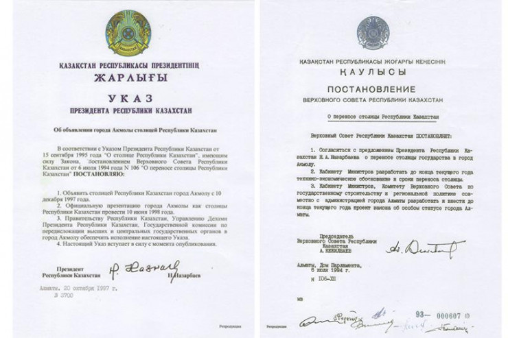 20 октября 1997 года Первый Президент страны подписал Указ "Об объявлении города Акмолы столицей Республики Казахстан". Согласно документу Акмола стала новой столицей независимого Казахстана 10 декабря 1997 года. Спустя полгода, в июне 1998 года, провели официальную презентацию города.