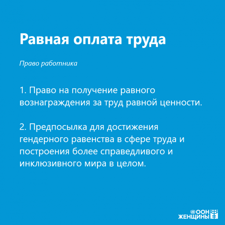 Различные международные конвенции и уставы, касающиеся прав в сфере труда, требуют от государств недопущения дискриминации в этой сфере. Так, например, Конвенция № 111 Международной организации труда (МОТ), принятая еще в 1958 году, запрещает всякое "различие, в том числе по признаку пола, ведущее к нарушению равенства возможностей или обращения в области труда и занятий". Неравенство в оплате труда — это проблема, с которой сталкиваются женщины во всем мире и решить которую можно только комплексом мер. Эти меры должны включать условия равного входа на рынок труда, в том числе равных возможностей для переобучения и повышения квалификации, равного доступа к руководящим позициям и многое другое. Немаловажно также устранять преграды, создаваемые дискриминационным восприятием, гендерными ролями, стереотипами, укоренившимися в обществе и не позволяющими женщинам и девочкам реализовать себя в профессиях, где доминируют мужчины.