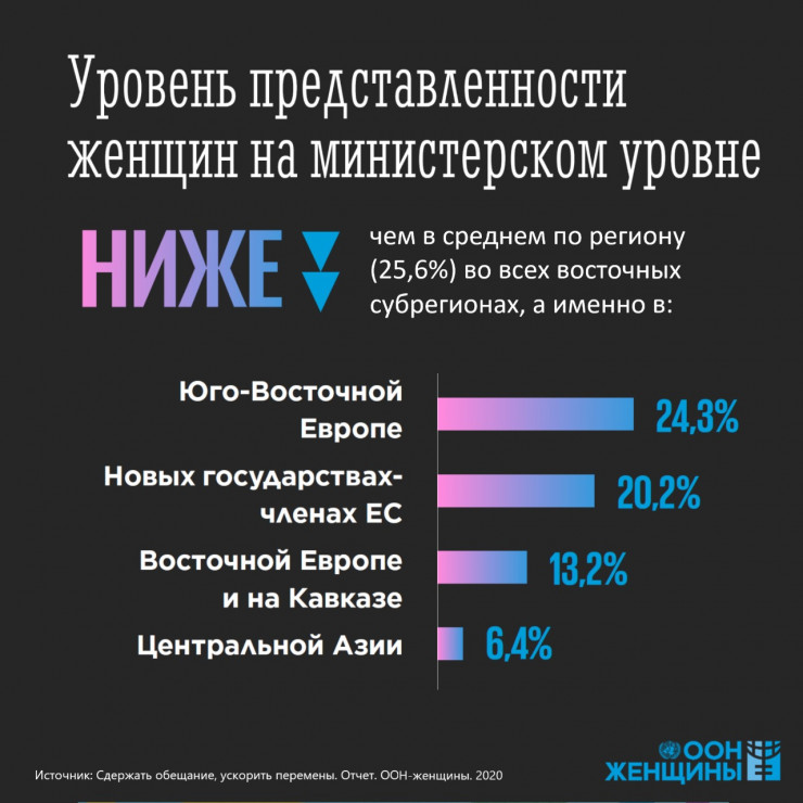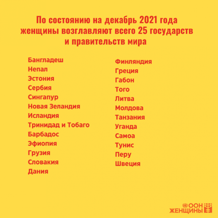 По состоянию на декабрь 2021 года женщины возглавляли только 25 государств и правительств мира. По оценкам специалистов, при нынешних темпах развития гендерное равенство в высших эшелонах власти не будет достигнуто еще 130 лет. Важно отметить, что во время пандемии быстрее и успешнее всех отреагировали на кризис страны, которые возглавляли женщины. При этом данные по миру, собранные ПРООН, Структурой "ООН-женщины" и Университетом Питтсбурга, показывают, что женщины по-прежнему исключены из структур планирования мер реагирования на пандемию и принятия решений. Несмотря на то, что женщины больше задействованы в борьбе с пандемией, в 130 странах мира в состав 262 рабочих групп, принимающих решения, вошло лишь 24 процента женщин, а в регионе Центральной и Южной Азии – 8 процентов.