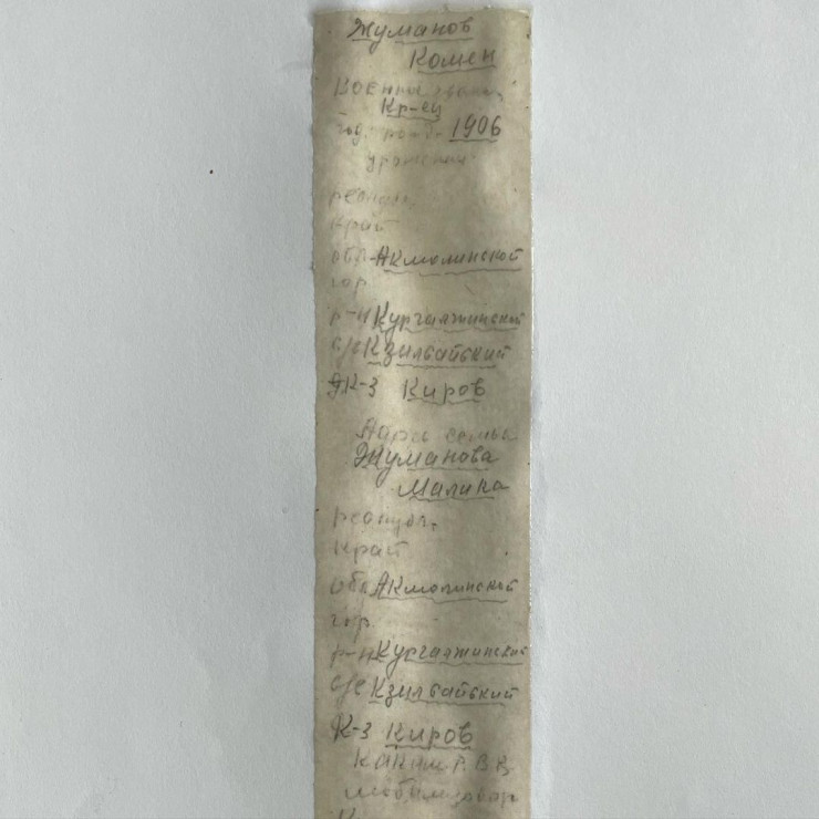 Найденный медальон, судя по записке в нем, принадлежал Комешу Жуманову 1906 года рождения. В данных "адрес семьи" вписана Жуманова Малика, Акмолинская область, Коргалжынский район, Кузылсайский сельский округ, Киров.