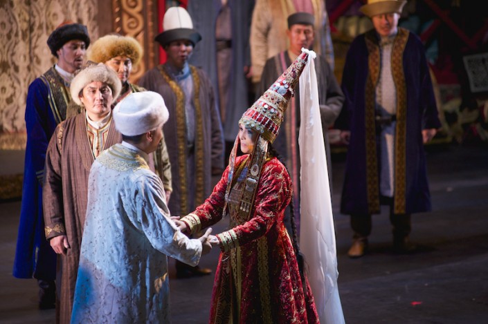 Постановка создавалась выдающимися деятелями искусства Казахстана и Италии. Музыкальный руководитель и дирижер - заслуженный деятель Казахстана, правнук композитора А. Жубанова -  Алан Бурибаев. Режиссер-постановщик - известный итальянский режиссер Джанкарло дель Монако, режиссер-консультант - народный артист Казахстана, профессор Есмухан Обаев, главный хормейстер - заслуженный деятель Казахстана Ержан Даутов. Художественное оформление оперы выполнили знаменитый сценограф современности Эцио Фриджерио и художник по костюмам - обладательница премии "Оскар" Франка Скуарчапино, ассистент художника по костюмам Арасель Досмуратова. Хореографы-постановщики - заслуженные деятели Казахстана Турсынбек Нуркалиев и Галия Бурибаева.