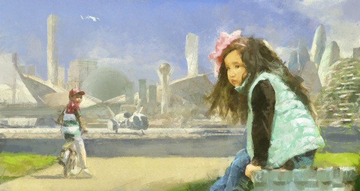 Ерлик Жарылгапов также уделил внимание людям будущего. Судя по его рисунку, в Казахстане будущего по-прежнему любят мотивы домбры и чаепитие.