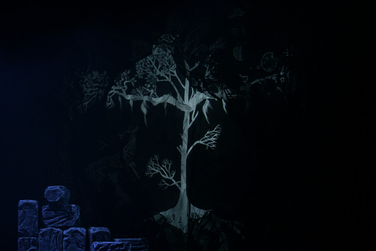 Ежелгі адамдар образындағы бишілердің ырғақты биі, кеудеңді үрей мен қорқынышқа, алай-түлей сезімге толтыратын екпінді музыка, сұр түсті тастарға толы сахна көріністері есіңді жиғызбастан сол заманның бізге беймәлім атмосферасына жетелеп алып кетеді де, соңғы актісінде Қорқыт қайта аспанға ұшып, одан соң жаңбыр жауып жер жаңарғанша санаңды уысынан бір сәтке де шығармайды.