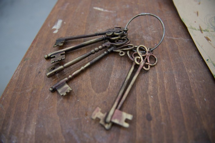 А вот интересная связка ключей, таких сейчас не купить в магазине, мастерам пришлось резать металл, паять и даже ковать, чтобы ключи получились точно как в XVIII веке. Золотой нагрудный знак мэра города сделан из силикона, который отливали в специальных пластиковых формах и покрывали поталью (имитация сусального золота).