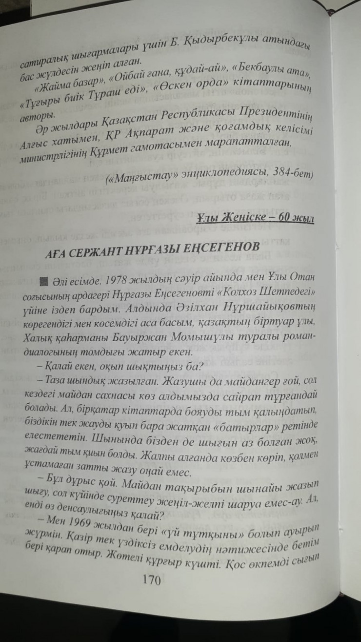 Өз кітабында Еңсегенов Нұрғазы былай деп жазады: "Егер СССР мен Финляндия арасындағы бітім 7/Х-44 жылы болған болса, таза ұрыста болған күнімнің саны 300-ден асады. 1945 жылы 13 апрельде Вена қаласын алуға қатыстық. Осы үшін "За взятие Вены" және "За боевые заслуги" медальдарымен наградталдым".