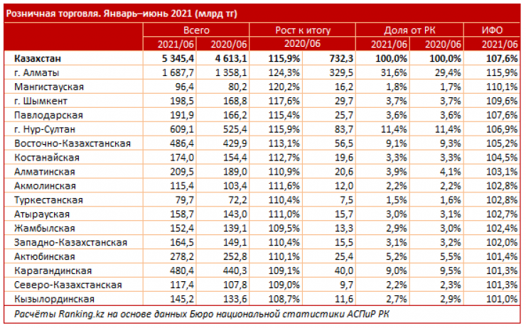 По итогам первого полугодия объем розничной торговли в стране достиг 5,3 триллиона тенге. Это на 15,9 процента больше, чем годом ранее, передает Tengrinews.kz со ссылкой на мониторинговый проект Ranking.kz.