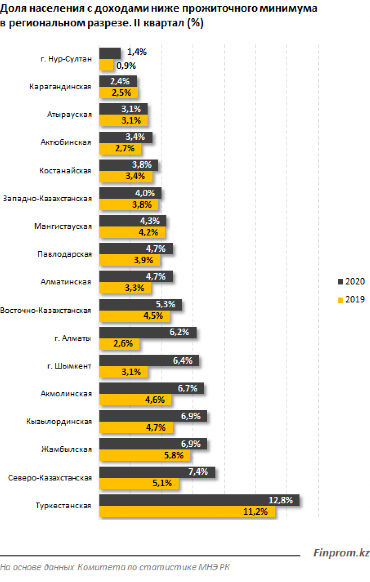 В Алматы доля населения с доходами ниже прожиточного минимума составила 6,2 процента (годом ранее - 2,6 процента), в Шымкенте - 6,4 процента (годом ранее - 3,1 процента).
