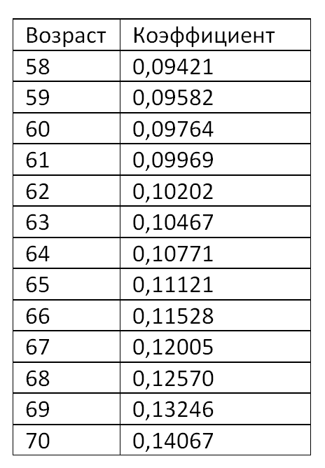 Этот коэффициент охватывает граждан от года до 79 лет. Для того чтобы наглядно показать, как он работает, достаточно самого популярного возраста для выхода на пенсию.