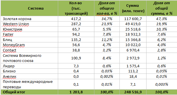 Лидером при переводах денег за рубеж и из-за рубежа в Казахстан остается Золотая корона. Также при отправке переводов денег значительны доли переводов денег через системы Western Union, Contact, Юнистрим, Блиц и Faster.